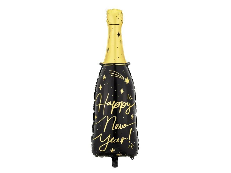 Balão foil (em folha de alumínio) em forma de garrafa de champanhe com a inscrição "Happy New Year", ideal para a comemoração do Ano Novo.