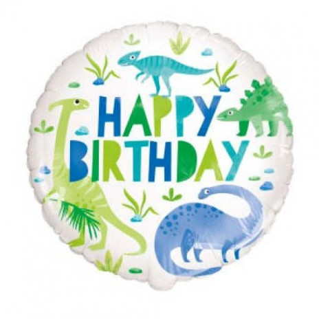 Balão redondo em foil com a inscrição "Happy Birthday" com vários dinossauros impressos em azul e verde para decorar a sua festa de aniversário com o mesmo tema.