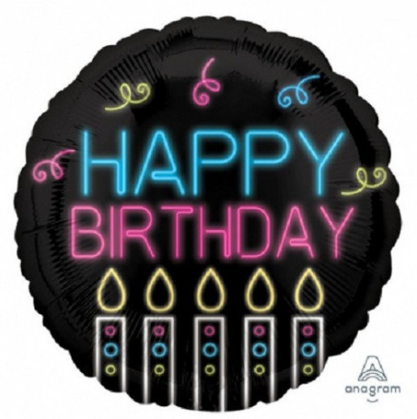 Balão foil redondo com a inscrição "Happy Birthday" em neon. Ideal para qualquer festa de aniversário. Pode ser cheio com hélio ou ar.