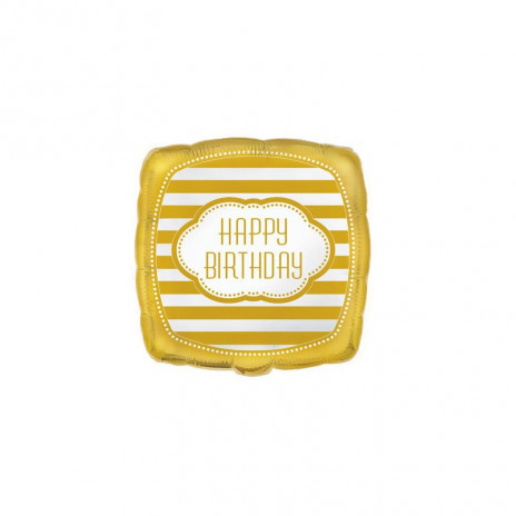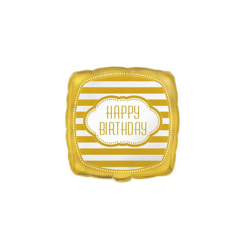Balão foil quadrado com a inscrição "Happy Birthday" às riscas em dourado. Ideal para qualquer festa de aniversário. Pode ser cheio com hélio ou ar.