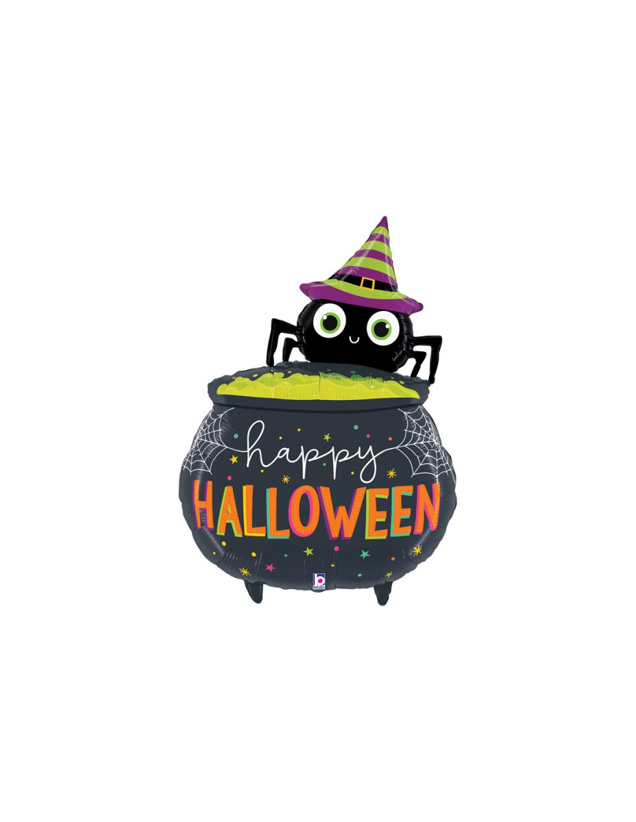 Balão foil (metálico) de caldeirão com aranha com a inscrição "Happy Halloween" para decoração de festas de Halloween com cerca de 112cm.