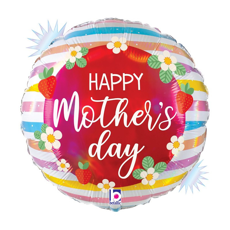 Balão foil redondo para comemoração do Dia da Mãe com flores e morangos com cerca de 46cm de diâmetro.
