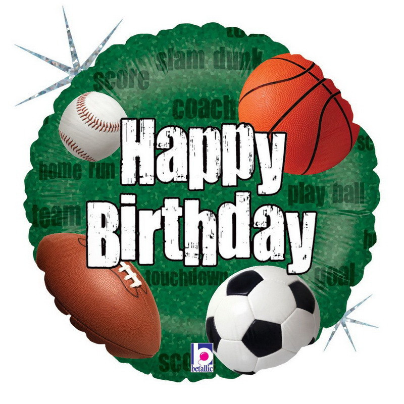Balão metálico (foil) redondo holográfico com a inscrição "Happy Birthday " com bolas de vários desportos. Ideal para decorar a sua festa de aniversário.