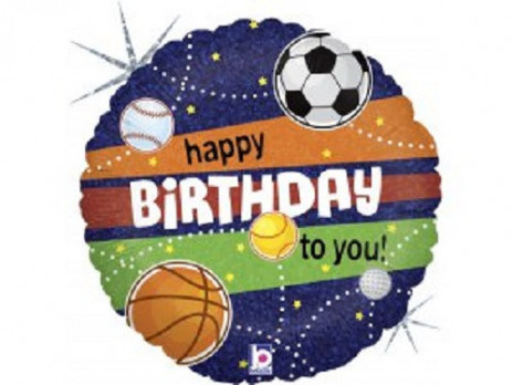Balão metálico (foil) redondo holográfico com a inscrição "Happy Birthday to You!" com bolas de vários desportos. Ideal para decorar a sua festa de aniversário.