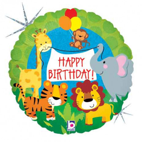 Balão metálico (foil) redondo holográfico com a inscrição "Happy Birthday" com animais da selva. Ideal para decorar a sua festa de aniversário.