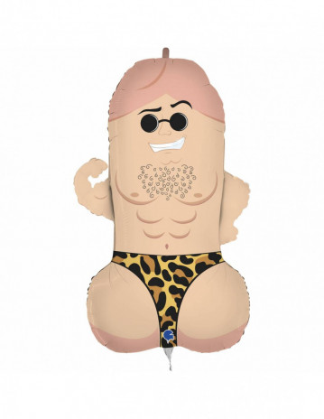 Balão foil com o formato de pénis super estiloso com cueca leopardo e óculos para decoração de festas de despedida de solteira. Pode encher com ar e suspender ou com hélio para flutuar.