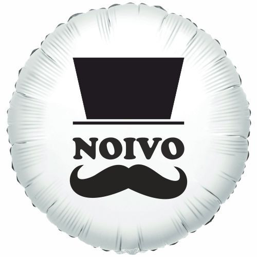 Balão para a festa de despedida de solteiro ou para o casamento em foil com formato redondo em branco com a palavra noivo em preto com bigode e cartola.