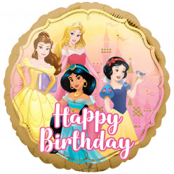 Balão foil redondo das Princesas da Disney com a inscrição "Happy Birthday" com 43cm. Ideal para decorar a tua festa com o tema das Princesas. O balão tem dupla face e tem as tuas princesas preferidas, a Ariel, Cinderela, Tiana, Rapunzel, Bela, Aurora, Jasmine e Branca de Neve.