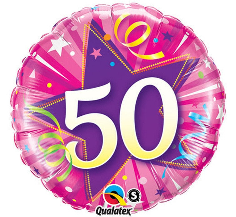Balão foil redondo com o número 50 em rosa para festejar o quiquagésimo aniversário. Pode ser cheio com hélio ou ar.