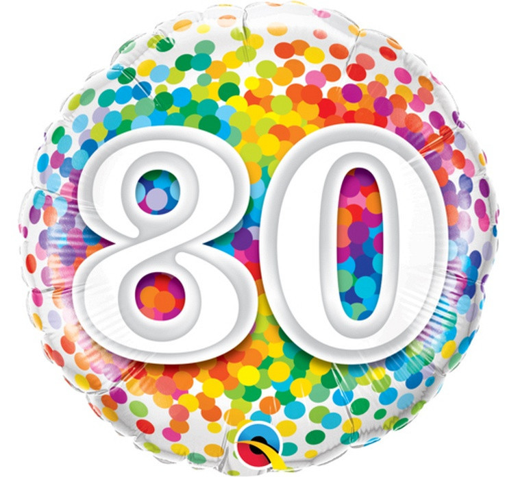 Balão foil redondo com o número 80 para festejar o octogésimo aniversário. Pode ser cheio com hélio ou ar.