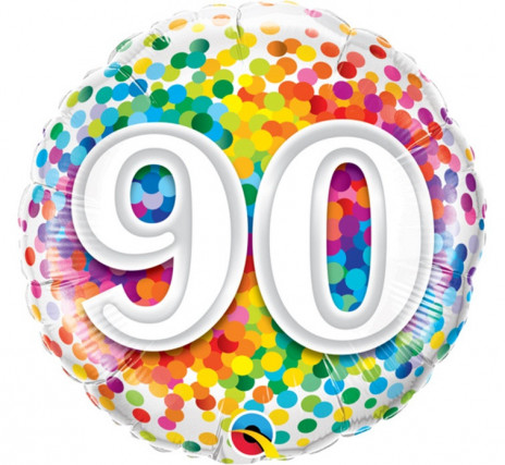 Balão foil redondo com o número 90 para festejar o nonagésimo aniversário. Pode ser cheio com hélio ou ar.