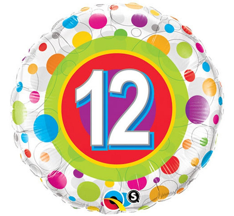 Balão foil redondo com o número 12 com bolinhas para qualquer aniversário. Pode ser cheio com hélio ou ar.