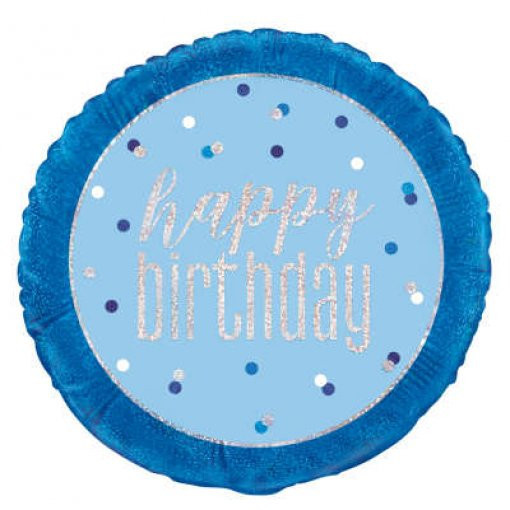 Balão foil redondo com a inscrição "Happy Birthday" em tons de azul com glitter. Ideal para qualquer festa de aniversário. Pode ser cheio com hélio ou ar.