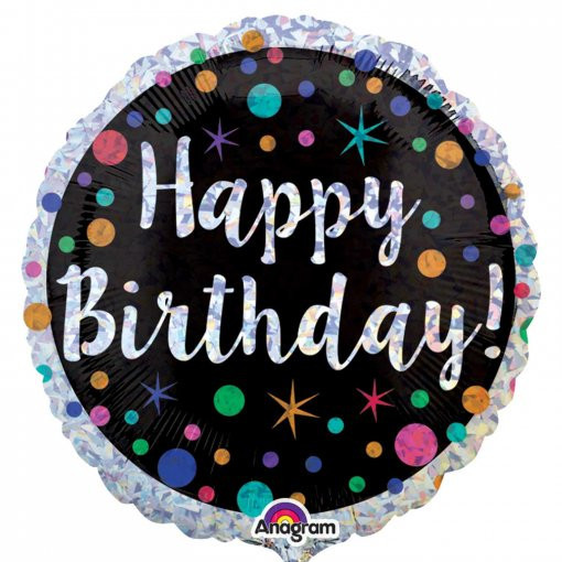 Balão foil redondo com a inscrição "Happy Birthday" holográfico com bolas. Ideal para qualquer festa de aniversário. Pode ser cheio com hélio ou ar.
