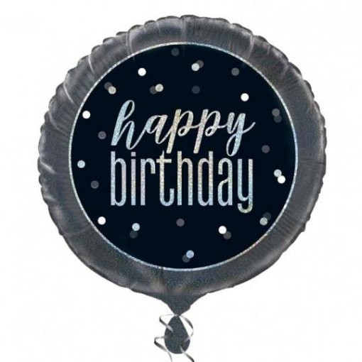 Balão foil redondo com a inscrição "Happy Birthday" em tons de preto com glitter. Ideal para qualquer festa de aniversário. Pode ser cheio com hélio ou ar.