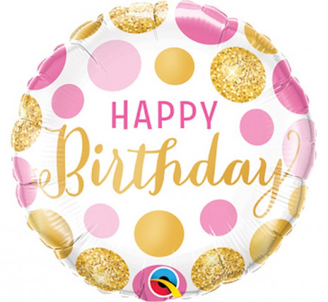 Balão redondo em tons de rosa e dourado às bolinhas com a inscrição "Happy Birthday" com as dimensões de 46 cm em folha de aluminio (foil). Pode encher-se com ar e suspender ou com hélio para flutuar.
