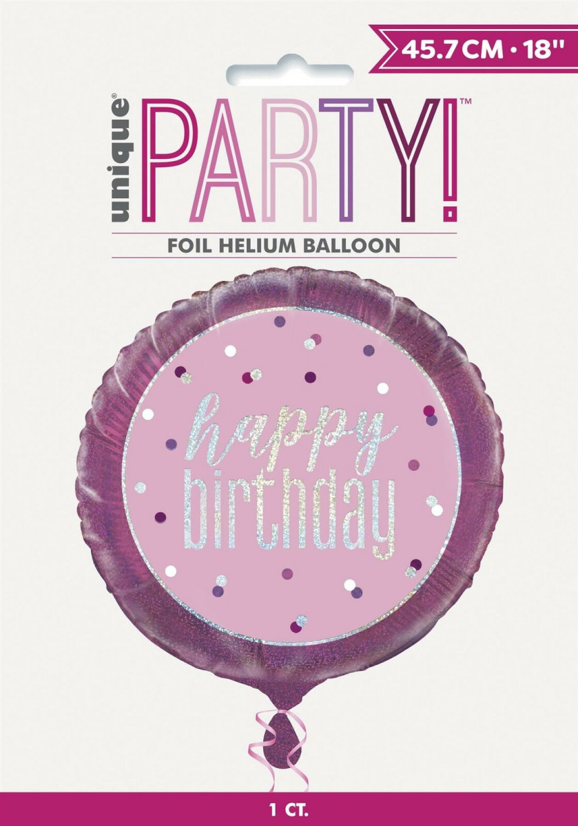Balão foil redondo com a inscrição "Happy Birthday" em tons de rosa com glitter. Ideal para qualquer festa de aniversário. Pode ser cheio com hélio ou ar.