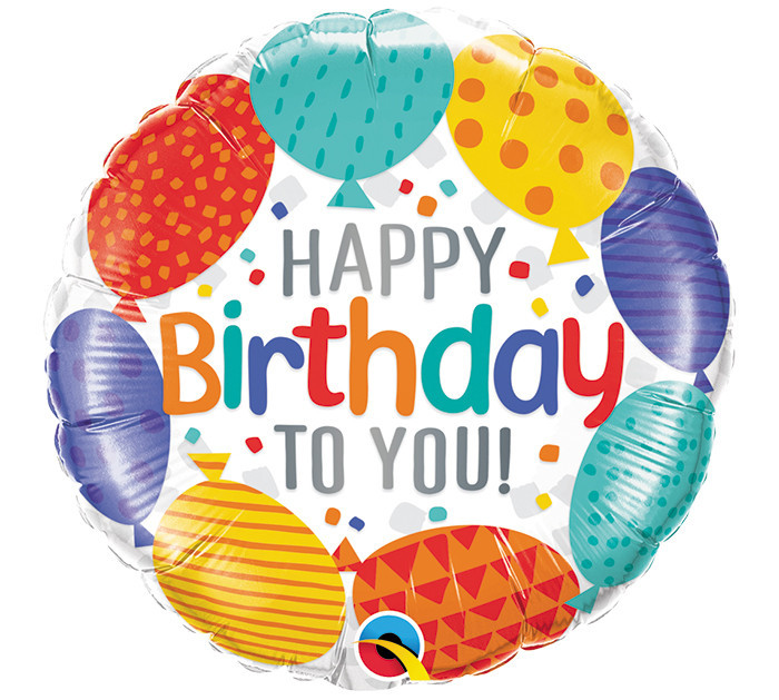 Balão metálico (foil) redondo com a inscrição Happy Birthday to You com balões coloridos impressos. Pode encher-se com ar e suspender ou com hélio para flutuar. Retenção de hélio: até 3 semanas.
