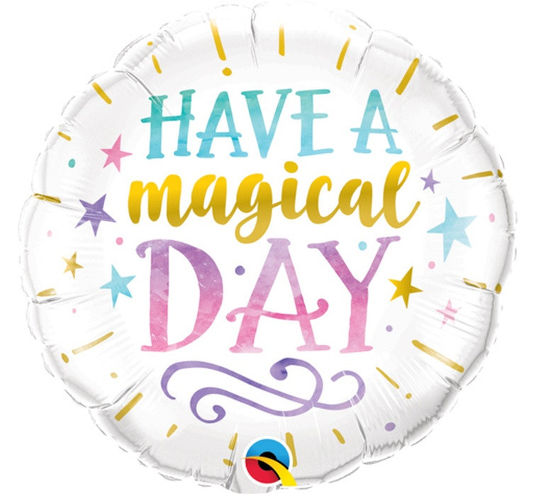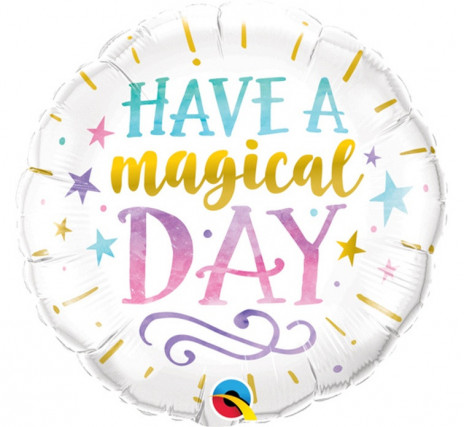 Balão redondo para qualquer ocasião especial com as dimensões de 46 cm em folha de aluminio (foil). Com a inscrição "Have a magical day". Pode encher-se com ar e suspender ou com hélio para flutuar.
