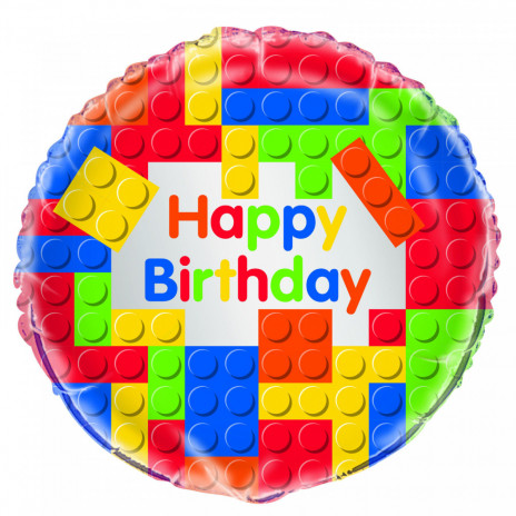 Balão foil redondo da Lego. Com a inscrição "Happy Birthday". Pode ser cheio com hélio ou ar.