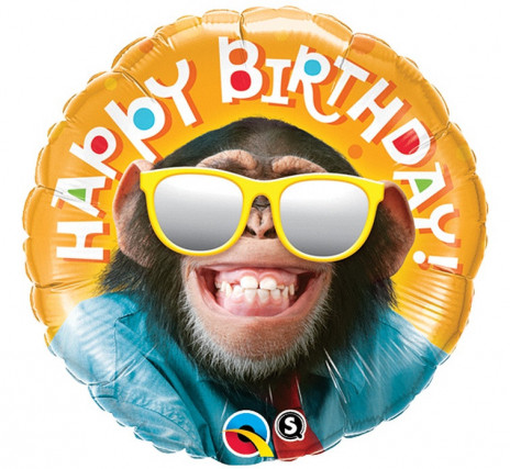 Balão foil redondo com um macaco a sorrir de óculos com a inscrição Happy Birthday. Os óculos do macaco funciona como espelho. Pode ser cheio com hélio ou ar.