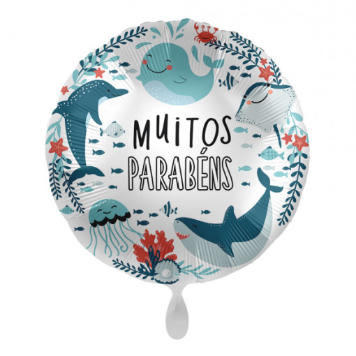 Balão redondo em foil com a inscrição "Muitos Parabéns" para decorar a sua festa de aniversário com o tema de animais marinhos.