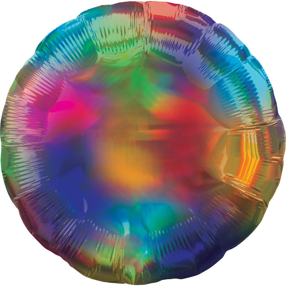 Balão foil em forma de círculo com as cores do arco íris iridescente para decorar qualquer tipo de festa ou evento.