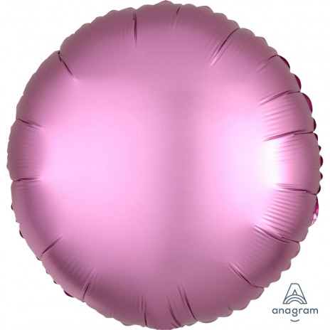 Balão foil em forma de círculo em rosa flamingo acetinado, com acabamento metálico fosco e cintilante.