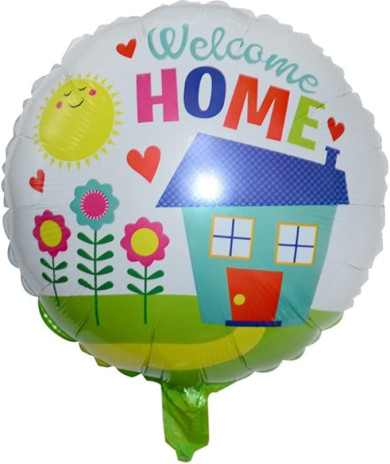 Balão metálico (foil) redondo com a inscrição Welcome Home, para uma receção de boas vindas em casa.