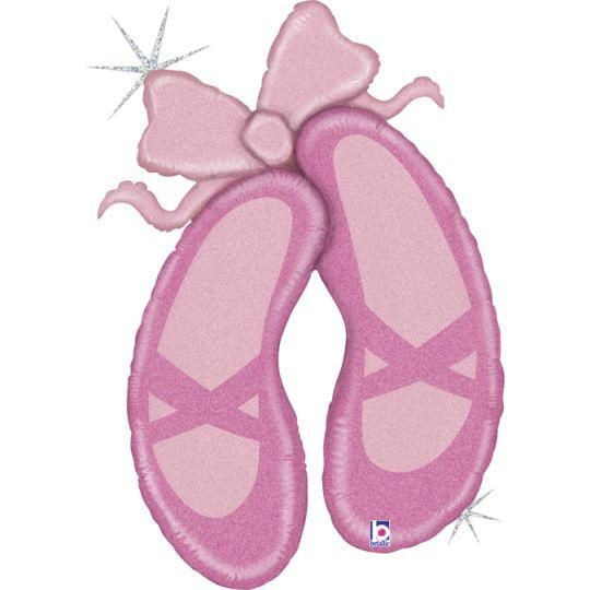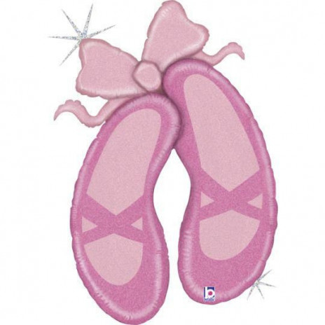 Balão foil (metálico) de sapatilhas de bailarina em cor de rosa com pormenores em glitter holográfico para decoração de festas de bailarina, entre outros, com cerca de 102cm.