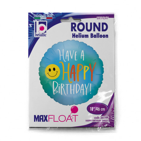 Balão metálico (foil) redondo com a inscrição "Have a Happy Birthday" com um smile. Ideal para decorar a sua festa de aniversário.