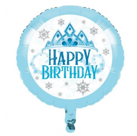 Balão em folha metálica (foil) redondo para a festa de aniversário com o tema de princesas de inverno ou da Frozen. Com a inscrição "Happy Birthday".