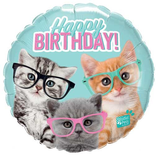 Balão foil redondo do Studio Pets, de gatinhos com óculos com 46cm. Ideal para decorar a tua festa de aniversário para os amantes dos animais.