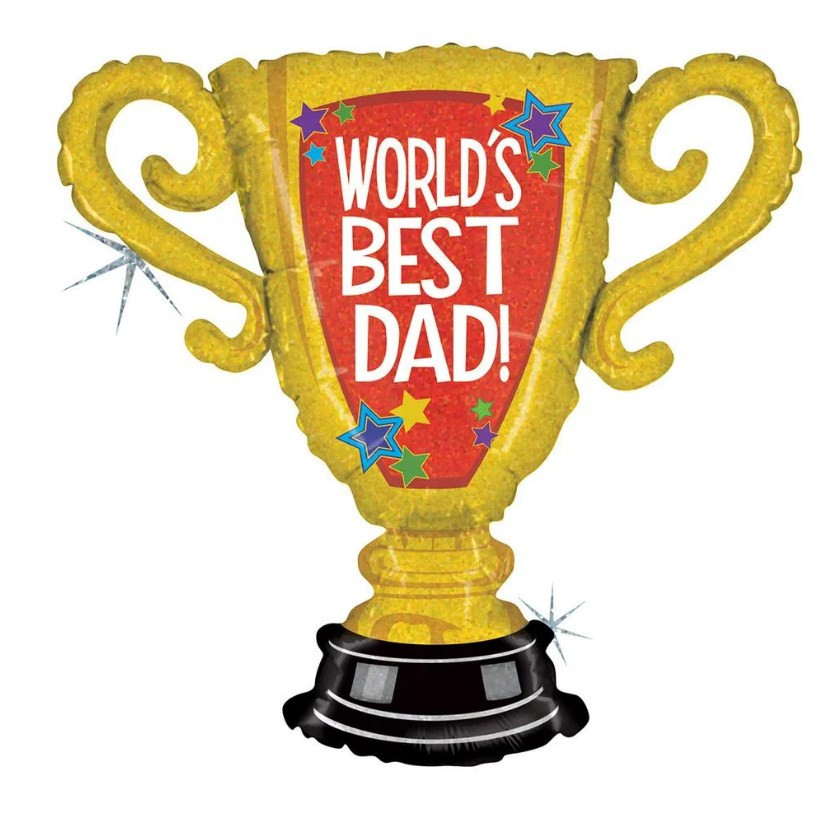 Balão foil (em folha de alumínio) com a forma de troféu com pormenores holográficos com a inscrição "World's Best Dad!", ideal para oferecer no dia do pai.