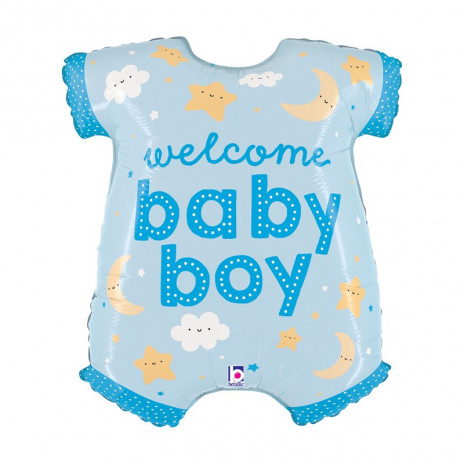 Balão foil com a forma de body de bebé em tons de azul com a inscrição "welcome baby boy" com 79cm. Ideal para decorar o chá de bebé, baby shower do seu bebé.