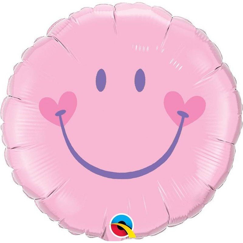 Balão redondo metalizado em tom de rosa, com um grande sorriso, para decoração da tua festa.