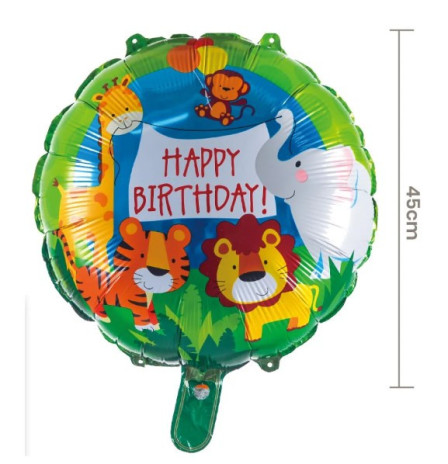 Balão metálico (foil) redondo com a inscrição "Happy Birthday" com animais da selva. Ideal para decorar a sua festa de aniversário.