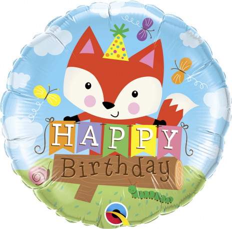 Um balão foil ótimo para festas da selva ou animais com uma simpática raposinha e a inscrição Happy Birthday.