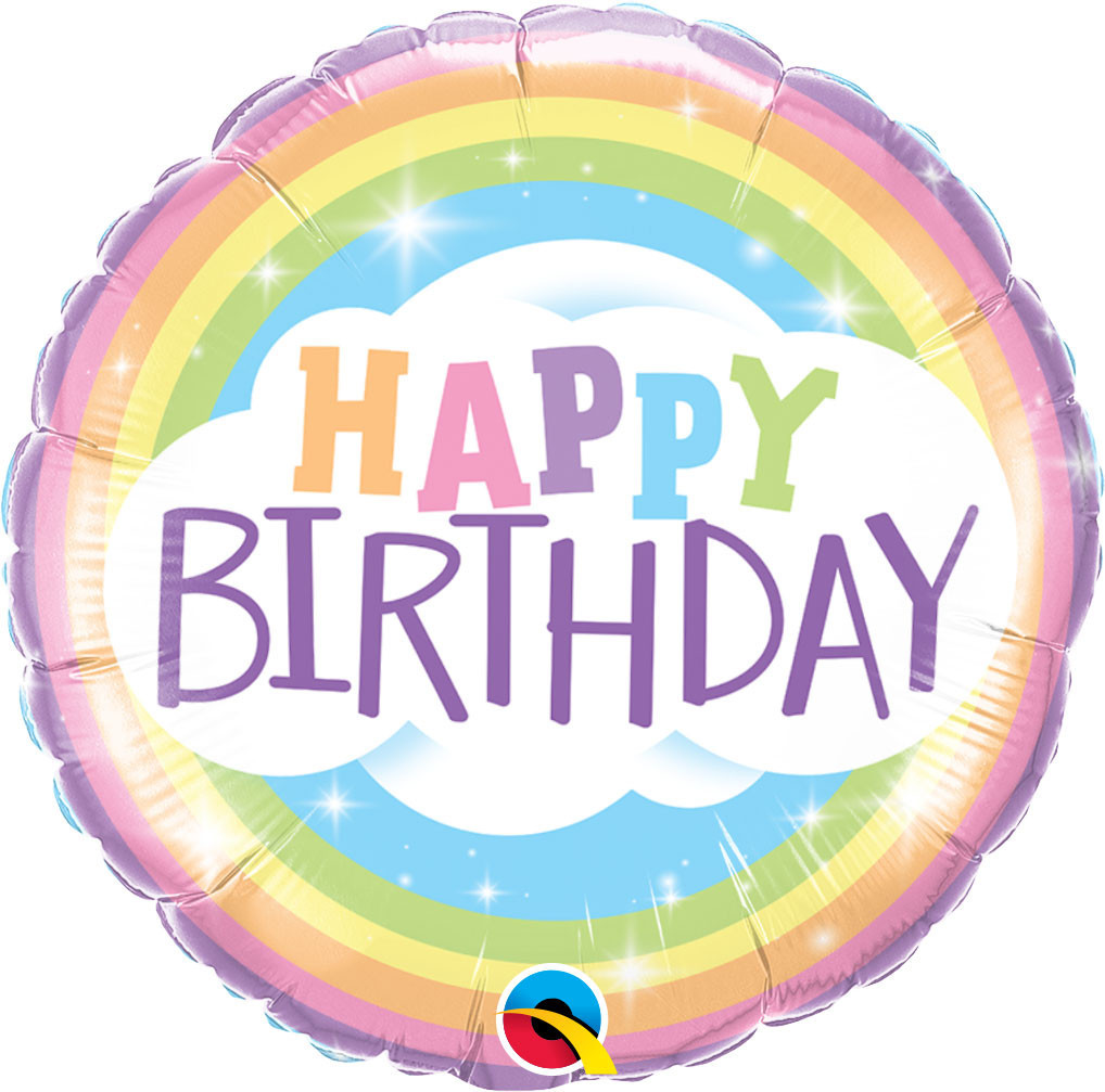 Balão foil com cores divertidas, nuvens, arco-iris e a inscrição Happy Birthday.