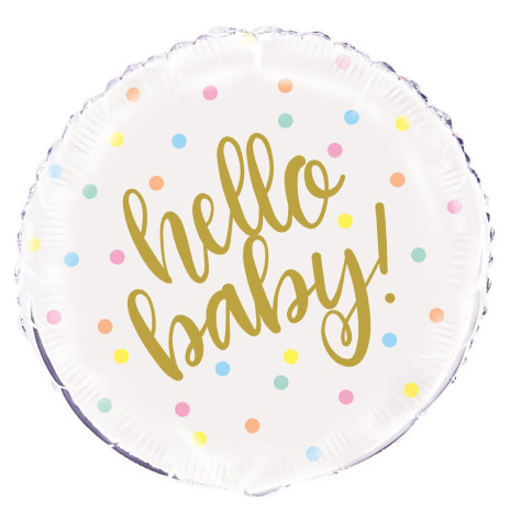 Um simpático e divertido balão em foil com a inscrição Hello Baby, ideal para novas mamãs e bebés recem-nascidos. para baby shower e chá de revelação.
