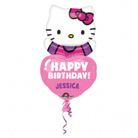 Um adorável balão foil da Hello Kitty, com um coração onde pode personalizar o nome da aniversariante utilizando as folhinhas de letras autocolantes fornecidas.