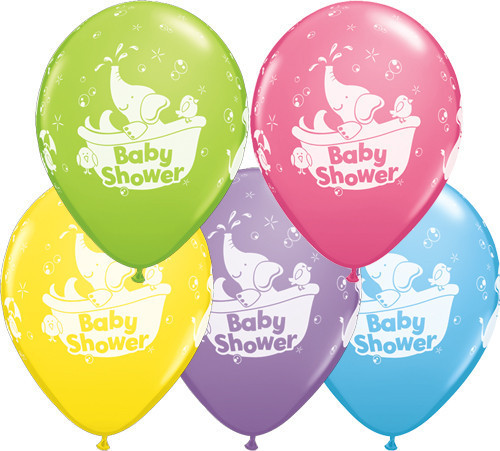Balão de latex ideial para chá de bebé, com elefantes. Em cinco cores diferentes, rosa, amarelo, roxo, azul e verde.