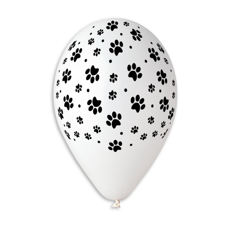 Balão branco em latex de alta qualidade com imagens de marcas de patinhas de cão na cor preta.
