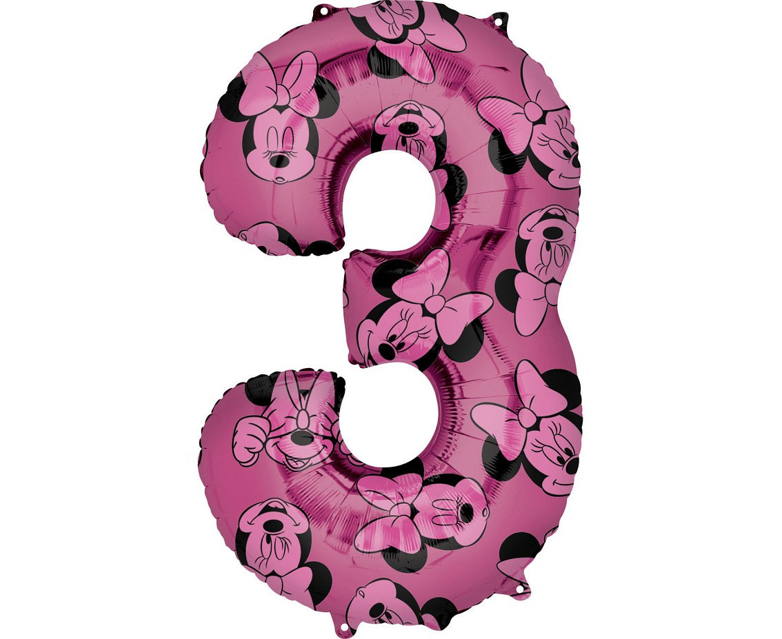 Balão número 3 em foil (folha de alumínio) da Minnie da Disney em cor de rosa com 66cms.