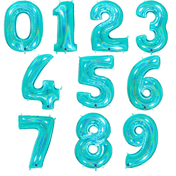 Balão em foil (folha de alumínio) em azul tiffany glitter holográfico com 102cm de altura (40" polegadas). O balão é reutilizável e inclui pontas para suspender o balão caso seja cheio com ar.