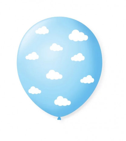 Balão latex de 13" (33cm) em azul com nuvens em branco. Também disponivel em rosa com nuvens em branco. Ideal para chás de bebé.