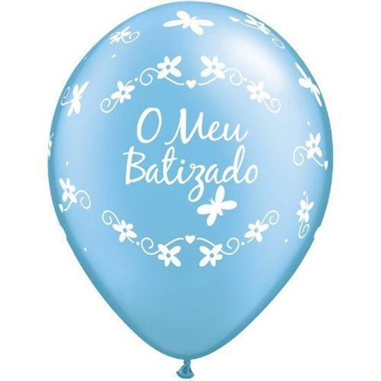 Divertidos balões azul em látex de 11", com a impressão O Meu Batizado. Qualidade premium e aptos para enchimento com hélio.