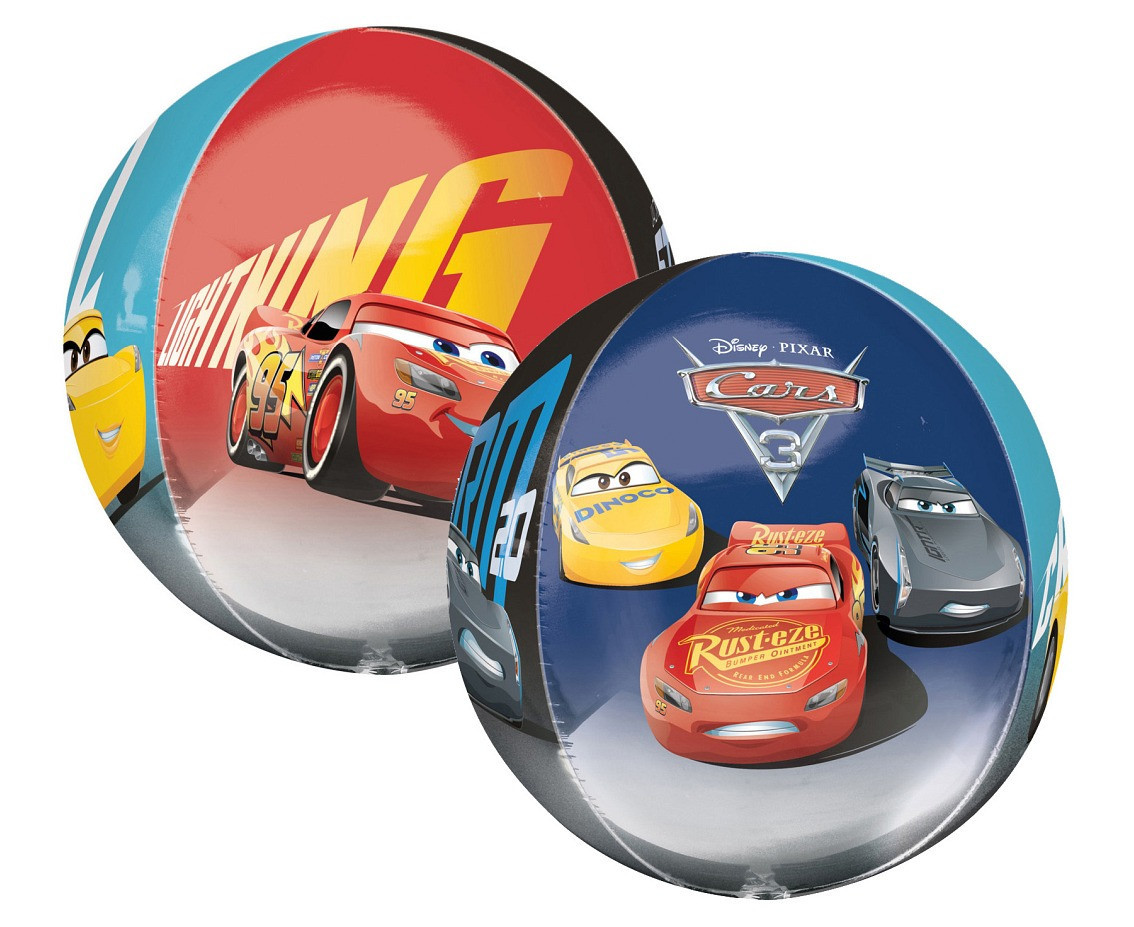 Balão orbz de tamanho grande com quatro bonitas imagens diferentes do filme do Cars 3, com o Faísca McQueen e outros carros.