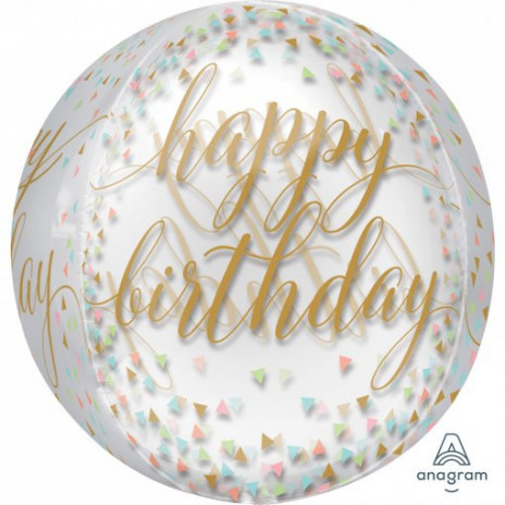 Balão orbz transparente com confettis coloridos para decoração de qualquer festa e/ou evento. Com a inscrição "Happy Birthday".