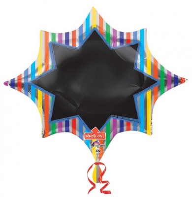 Belíssimo e colorido balão metálico com fundo em preto para permitir o personalizar, com marcador incluído, para animar ainda mais a tua festa de aniversario.A decoração ideal para qualquer festa de aniversário.Pode encher-se com ar e suspender ou com hélio para flutuar.Retenção de hélio: até 3 semanas.